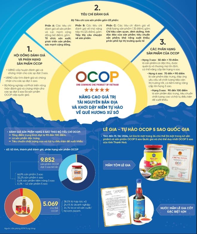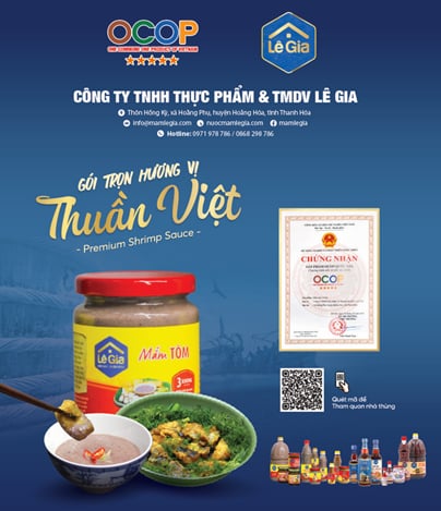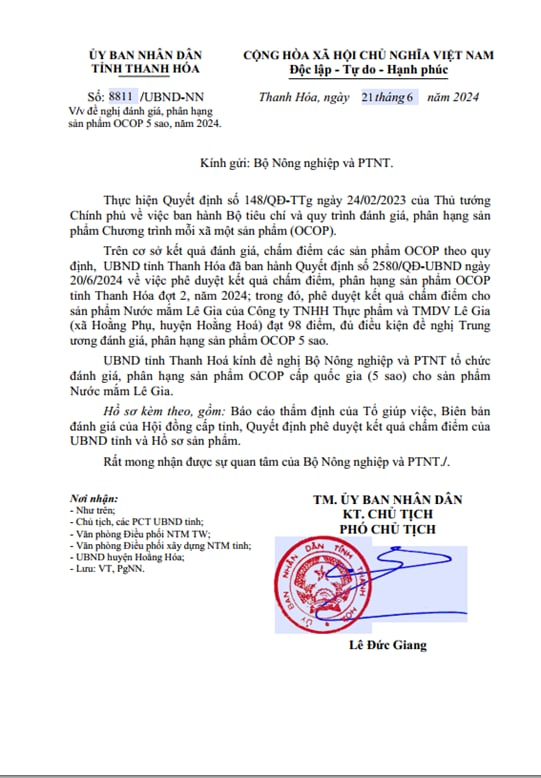 Trên cơ sở kết quả đánh giá, chấm điểm các sản phẩm OCOP theo quy định, UBND tỉnh Thanh Hóa đã ban hành Quyết định số 2580/QĐ-UBND ngày 20/6/2024 về việc phê duyệt kết quả chấm điểm, phân hạng sản phẩm OCOP đợt 2, năm 2024. Theo đó, sản phẩm nước mắm Lê Gia của Công ty TNHH Thực phẩm và Thương mại Dịch vụ Lê Gia (địa phương: xã Hoằng Phụ, huyện Hoằng Hóa) đã đạt 98 điểm, đủ điều kiện đề nghị Trung ương đánh giá, phân hạng OCOP 5 sao.