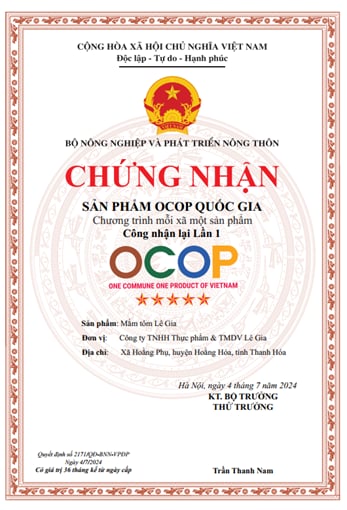 Theo Quyết định số 2890/QĐ-BNN-VPĐP ngày 30-6-2021 của Bộ Nông nghiệp và Phát triển nông thôn về phê duyệt kết quả đánh giá, phân hạng sản phẩm Chương trình mỗi xã, phường một sản phẩm (OCOP) cấp quốc gia năm 2020, có 20 sản phẩm được công nhận là sản phẩm OCOP 5 sao quốc gia đầu tiên. Trong đó có mắm tôm Lê Gia