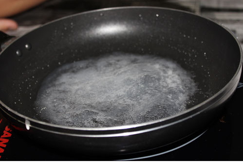 - Bắc chảo chống dính lên bếp, để lửa ở mức độ vừa (không quá to hoặc không quá nhỏ), dùng cây chổi phết một lớp dầu ăn mỏng quanh chảo