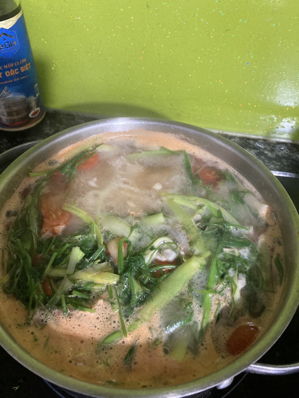 - Chờ nước canh (lúc này mới chỉ có cà chua xào tỏi phi) sôi thì bạn trút tô cá khoai vào,cho lửa to hết cỡ và để nồi canh sôi bùng lên, trút nốt tỏi tây và thìa là cắt khúc nhỏ vào.