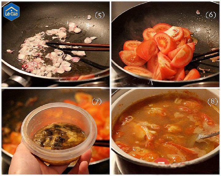 Đậu hũ cắt nhỏ mang đi chiên vàng. Hành lá rửa sạch cắt khúc. Cà chua cắt miếng vừa ăn, xào qua với dầu ăn ở lửa to. Cho cà chua vào nồi nước cua, nêm lại nồi nước dùng với một thìa cà phê mắm tôm Lê Gia, các loại gia vị cho vừa ăn rồi cứ tiếp tục đun tiếp ở lửa nhỏ.