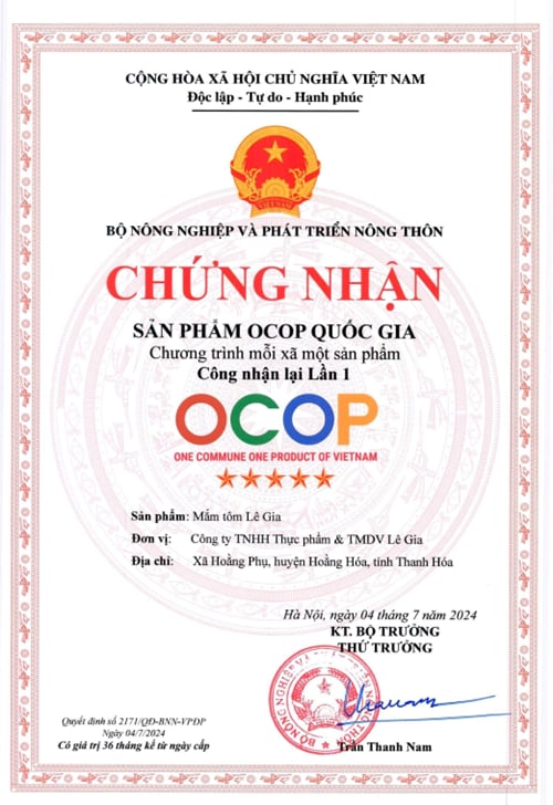 Chương trình OCOP (Mỗi xã một sản phẩm) là một chứng nhận uy tín khẳng định chất lượng, tác động cộng đồng và giá trị văn hóa của sản phẩm. Năm 2024, Lê Gia vinh dự trở thành chủ thể OCOP 5 sao duy nhất tại Thanh Hóa, với ba sản phẩm đạt chứng nhận: nước mắm, mắm tôm (4 sao), và ruốc tôm sú (3 sao).