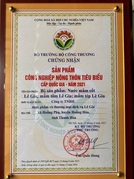Năm 2021, Bộ Công Thương đã công nhận bộ sản phẩm nước mắm, mắm tôm, và mắm tép của Lê Gia là sản phẩm công nghiệp nông thôn tiêu biểu cấp Quốc gia. Đây là danh hiệu dành cho những sản phẩm có chất lượng vượt trội và giá trị kinh tế cao, góp phần vào sự phát triển của ngành nông nghiệp địa phương.