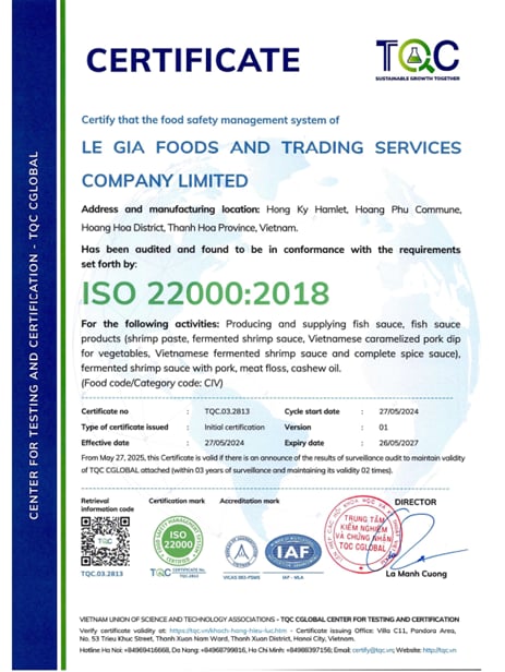 Các chứng nhận quốc tế là điều kiện quan trọng để sản phẩm thực phẩm có thể lưu hành hợp pháp trên thị trường mục tiêu, cho đến hiện tại Lê Gia vẫn không ngừng nỗ lực để có thể đáp ứng được các tiêu chuẩn và yêu cầu của các thị trường này.