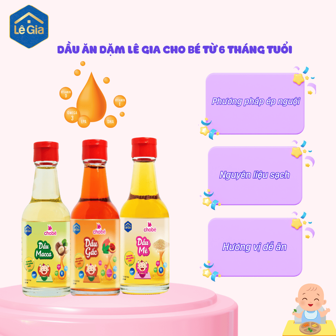 Dầu ăn dặm Lê Gia được sản xuất từ nguyên liệu tự nhiên, an toàn và phù hợp với nhu cầu dinh dưỡng của bé. Cách sử dụng dầu ăn dặm Lê Gia rất đơn giản và hiệu quả trong việc bổ sung chất béo cho bé trong giai đoạn ăn dặm.