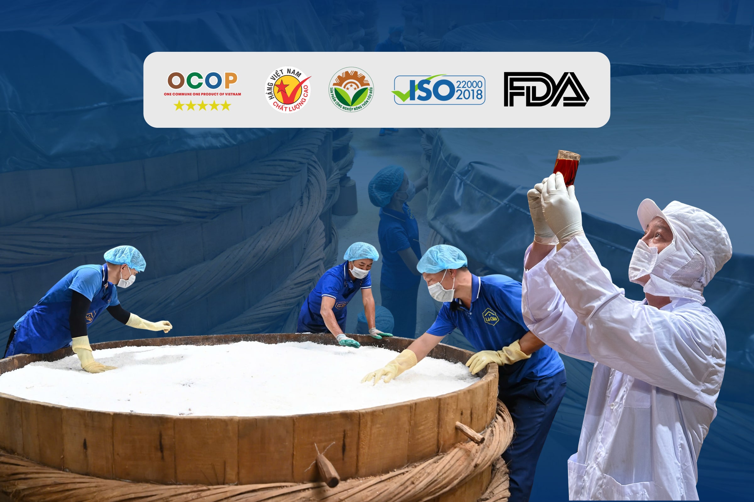 Sản phẩm được theo hệ thống quản lý chất lượng chuẩn FSSC22000/ ISO 22000, HACCP/FDA với dây chuyền chiết rót đóng chai tự động, đảm bảo An toàn vệ sinh thực phẩm.
