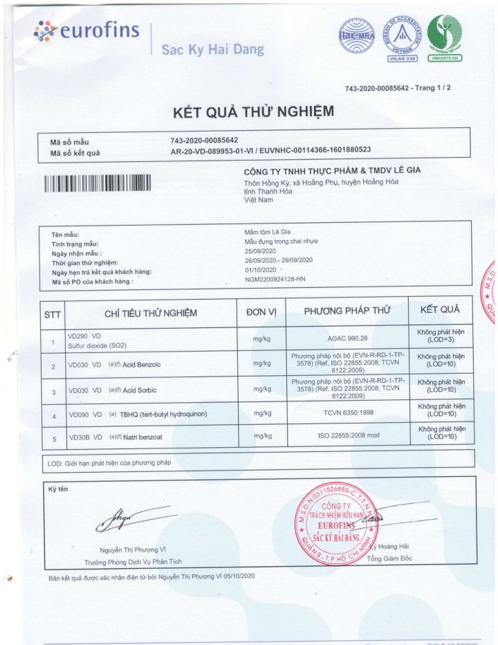 Kết quả kiểm định của mắm tôm Lê Gia