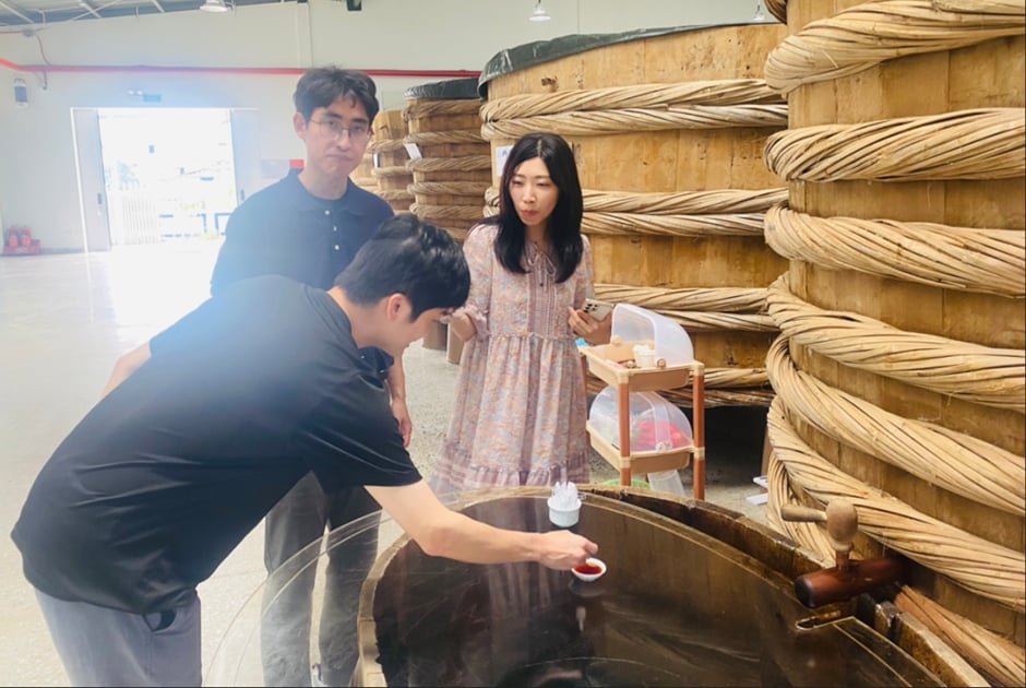 Du khách Hàn Quốc thích thú khi được nếm thử nước mắm nhỉ ra từ thùng gỗ