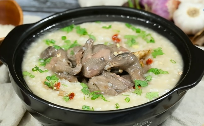 Cách làm: Sơ chế ếch, lấy phần thịt băm nhỏ, sau đó xào qua với hành phi cho thơm. Rau mồng tơi thái chỉ. Gạo cho vào nấu thành cháo trắng đặc. Khi thấy cháo chín mịn, cho rau vào nấu nhừ. Sau khi rau chín, cho thịt ếch vào, nêm gia vị, tắt bếp.