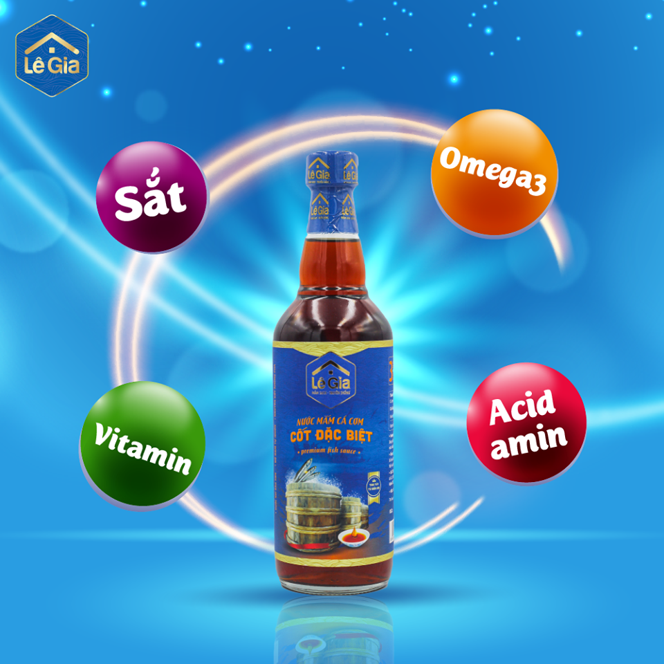 Chắt lọc tinh túy sau 2 năm ủ cá cơm tươi trong thùng gỗ, những giọt nước mắm sóng sánh, màu hồ phách, hậu vị thanh, mùi thơm dịu, được đóng chai thủy tinh với nắp thiết kế tiện lợi tạo thành Nước mắm Lê Gia- Cốt đặc biệt.