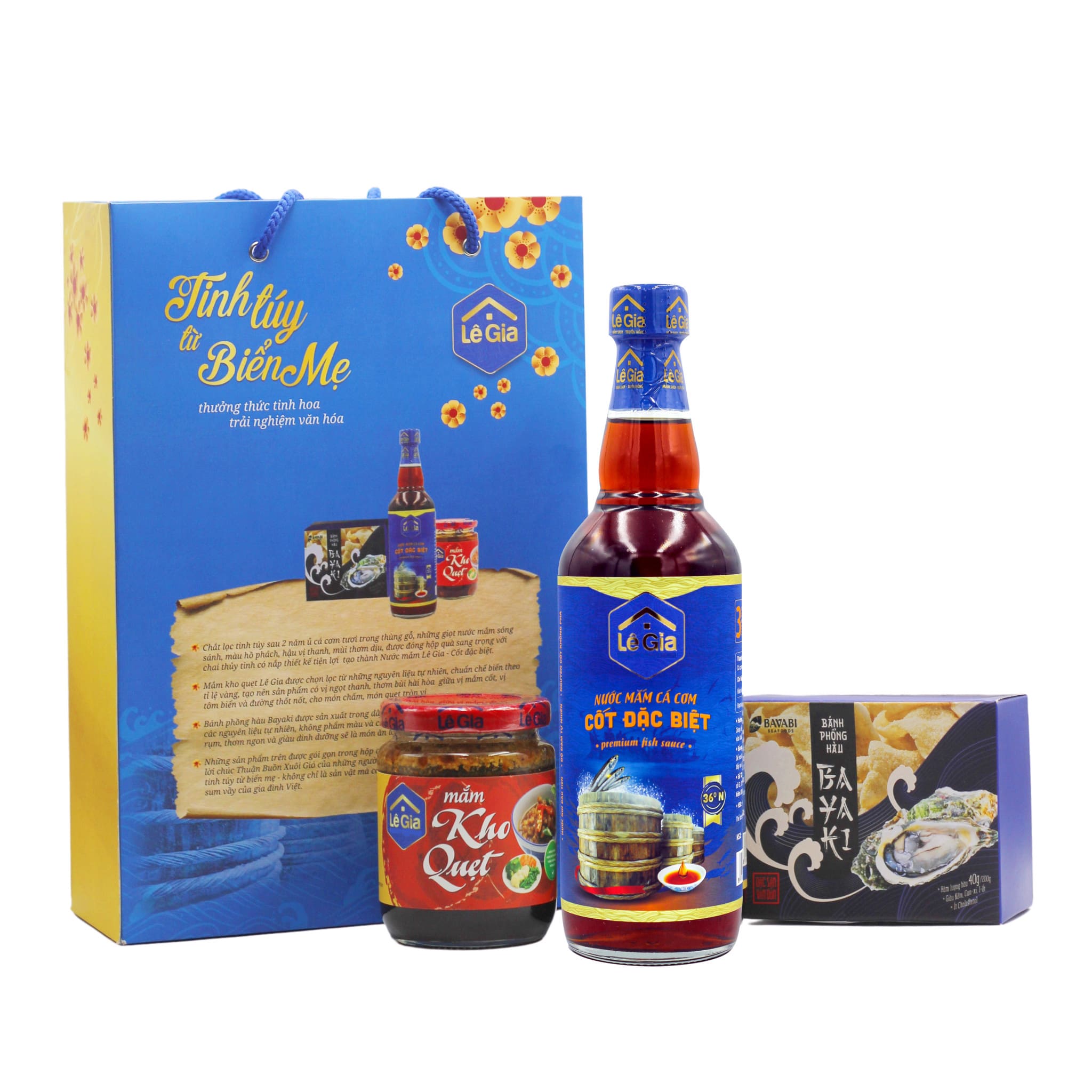 Và hơn hết là tình cảm chắt chiu chứa đựng những tinh hoa ẩm thực biển bên trong: Nước mắm Lê Gia cốt đặc biệt, mắm kho quẹt Lê Gia và Bánh phồng Hàu Bayaki.